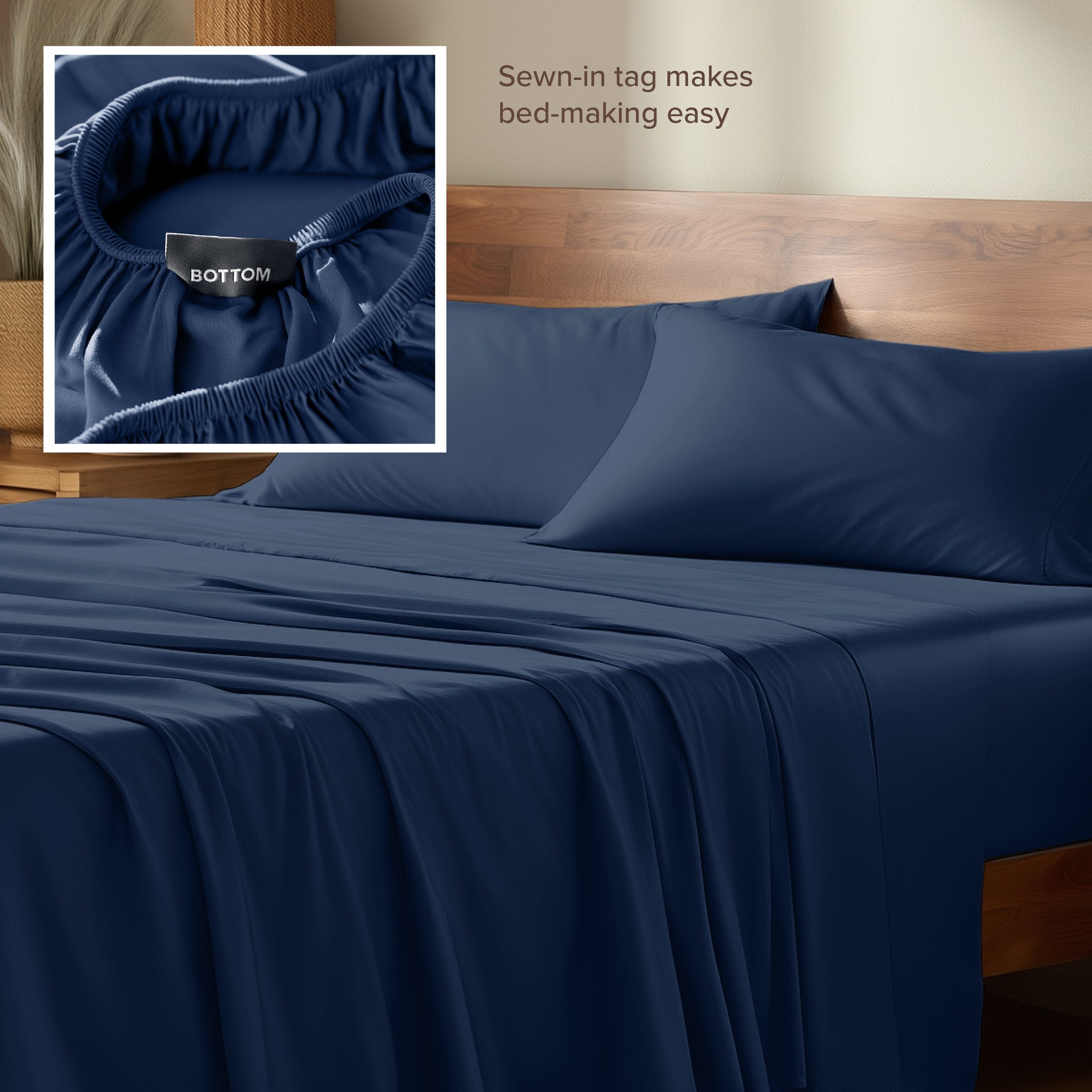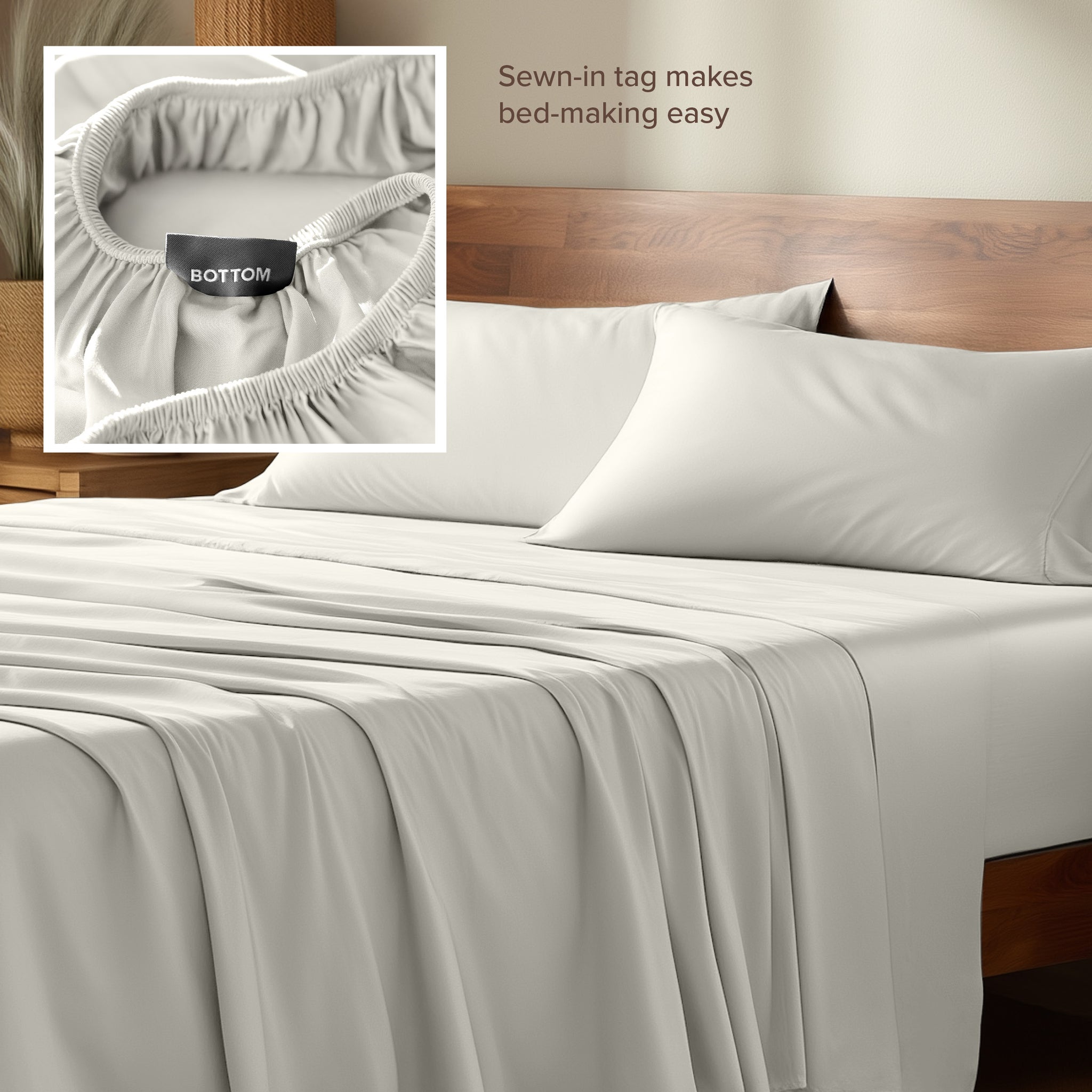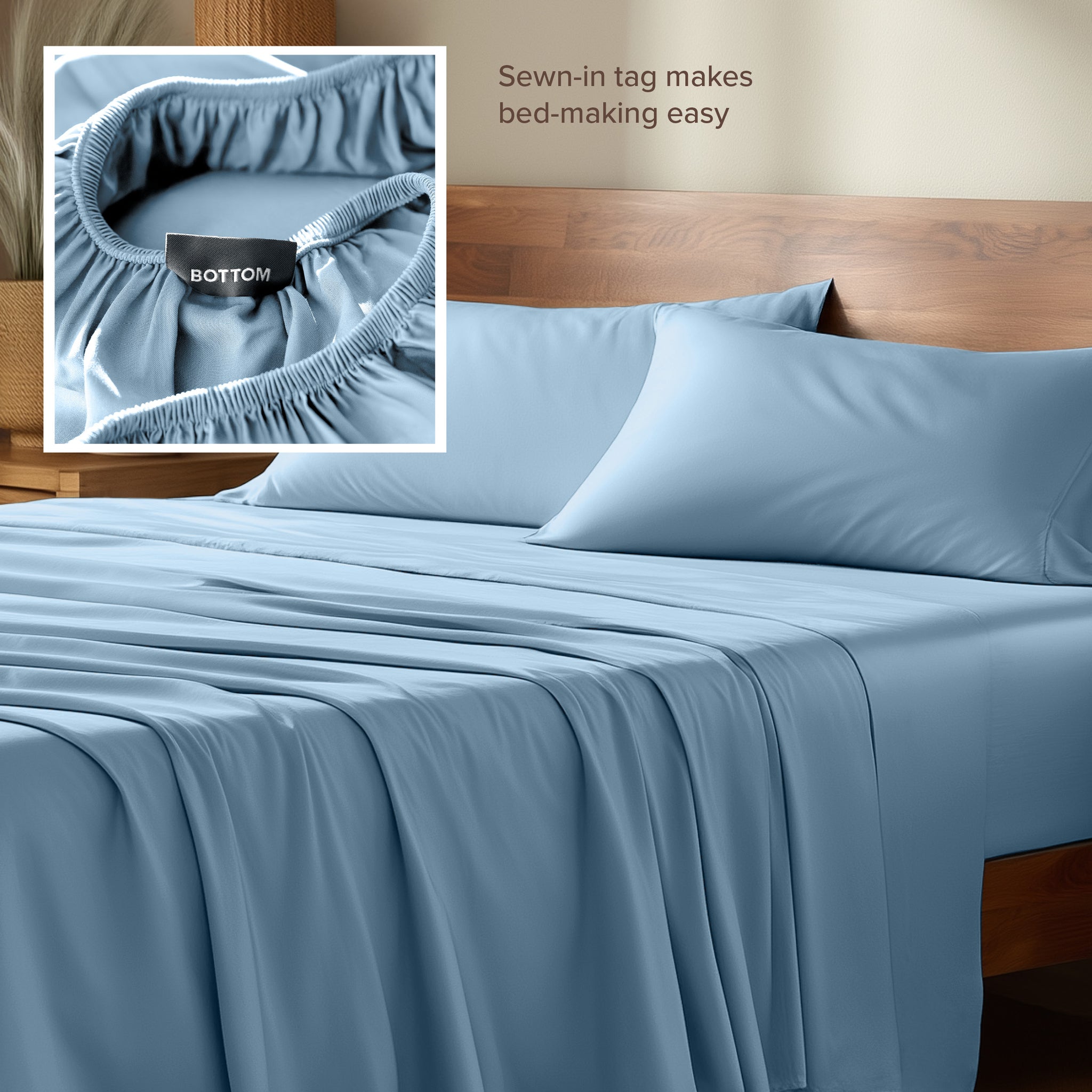 • Tag on bottom of fitted sheet simplifies bed making.