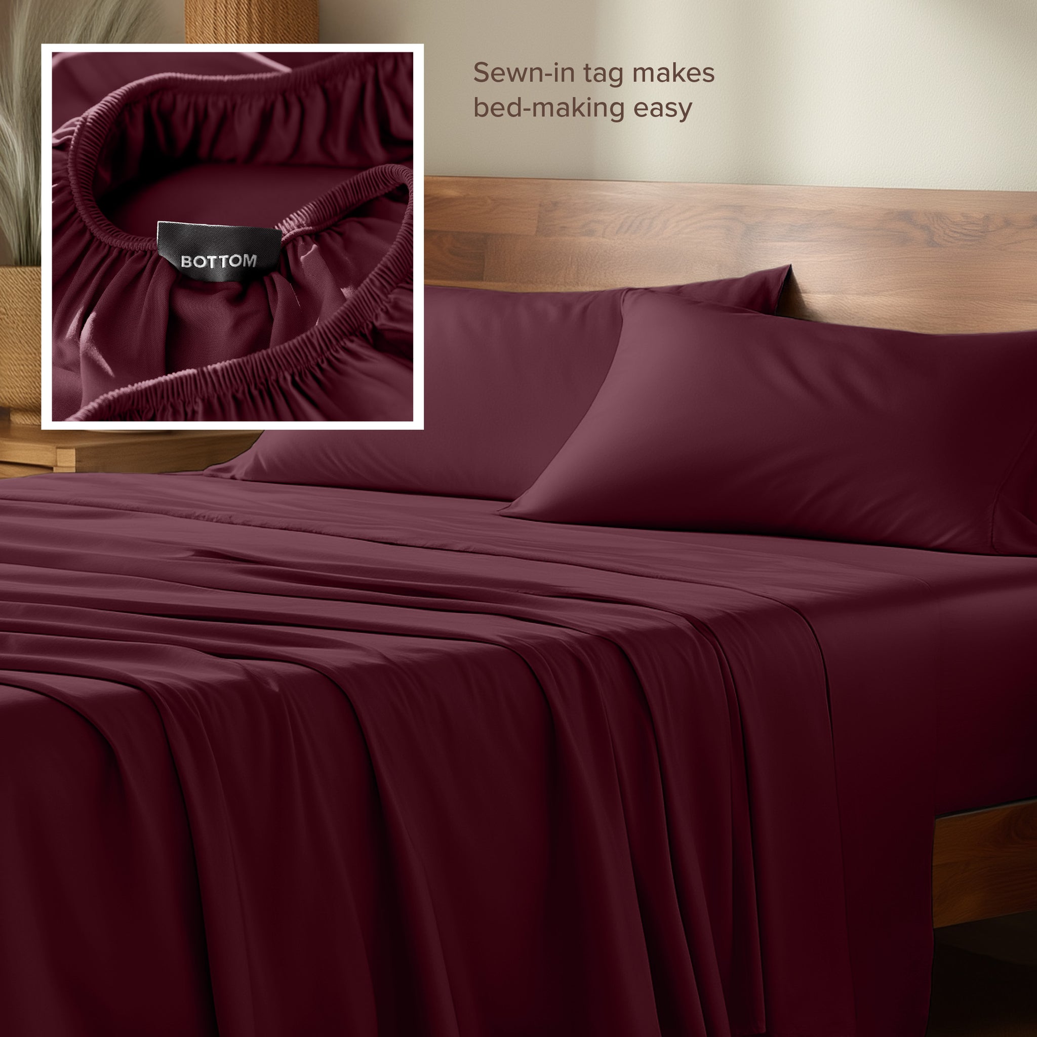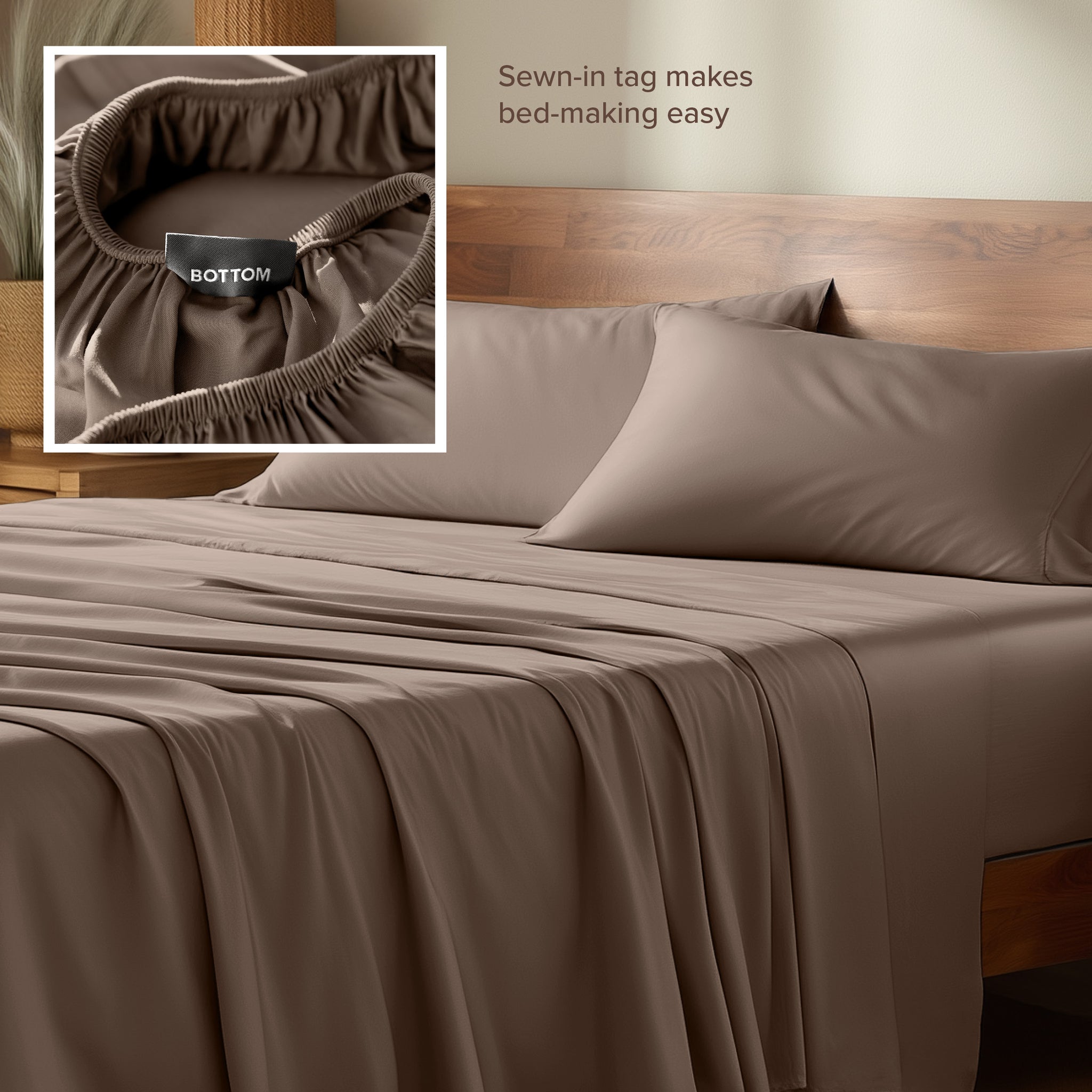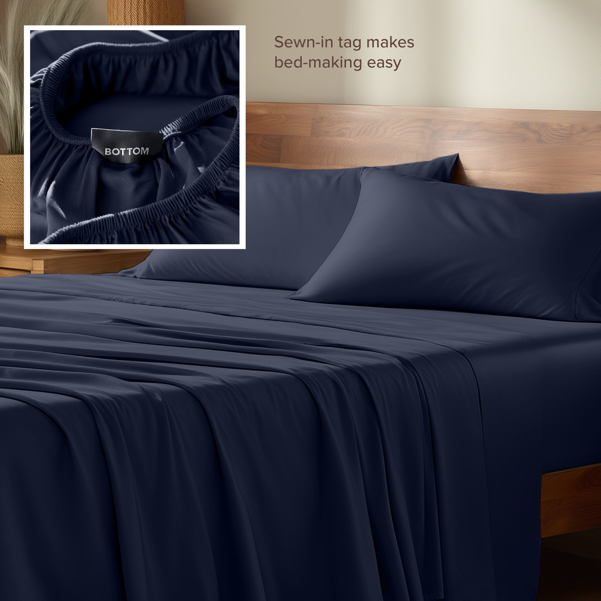 • Tag on bottom of fitted sheet simplifies bed making.