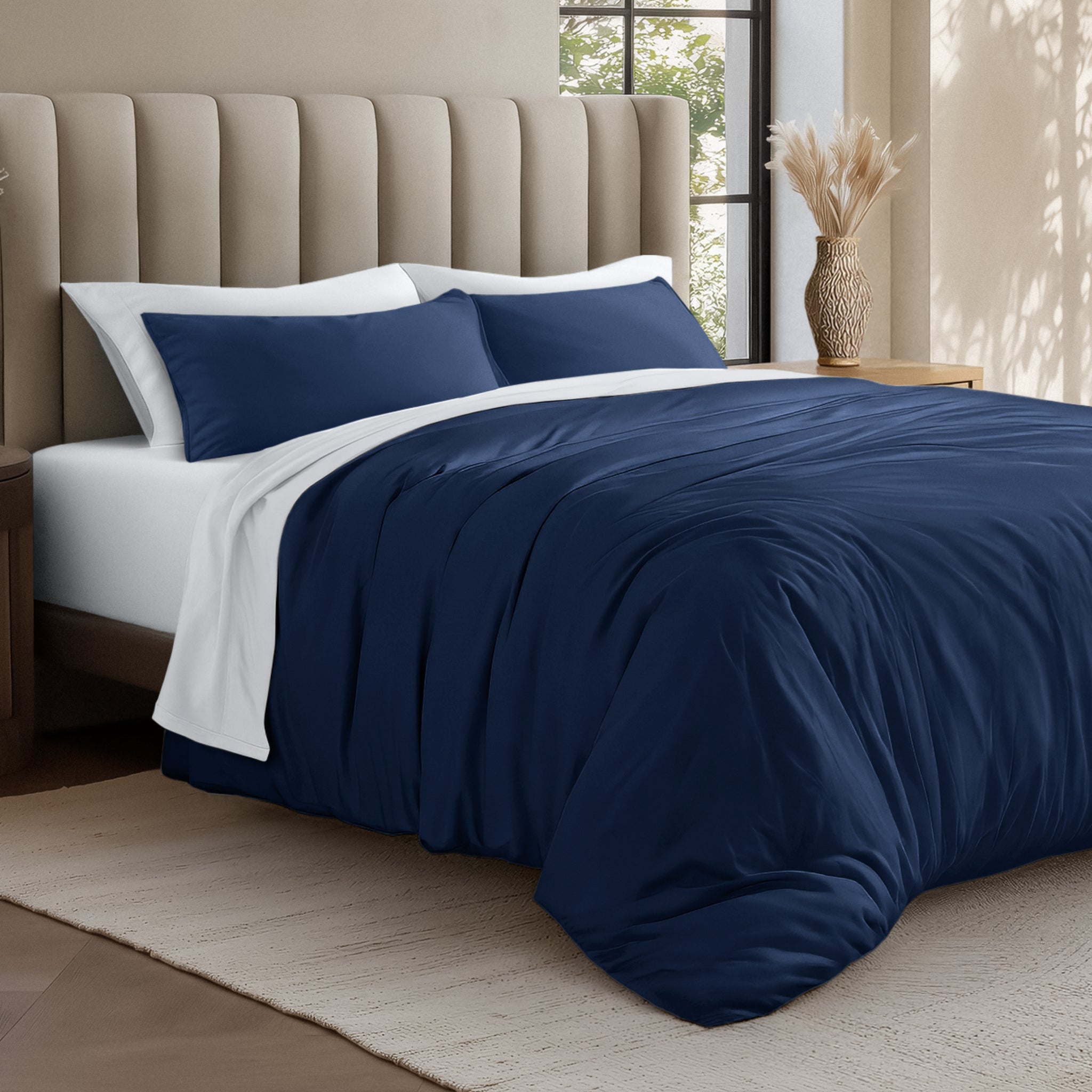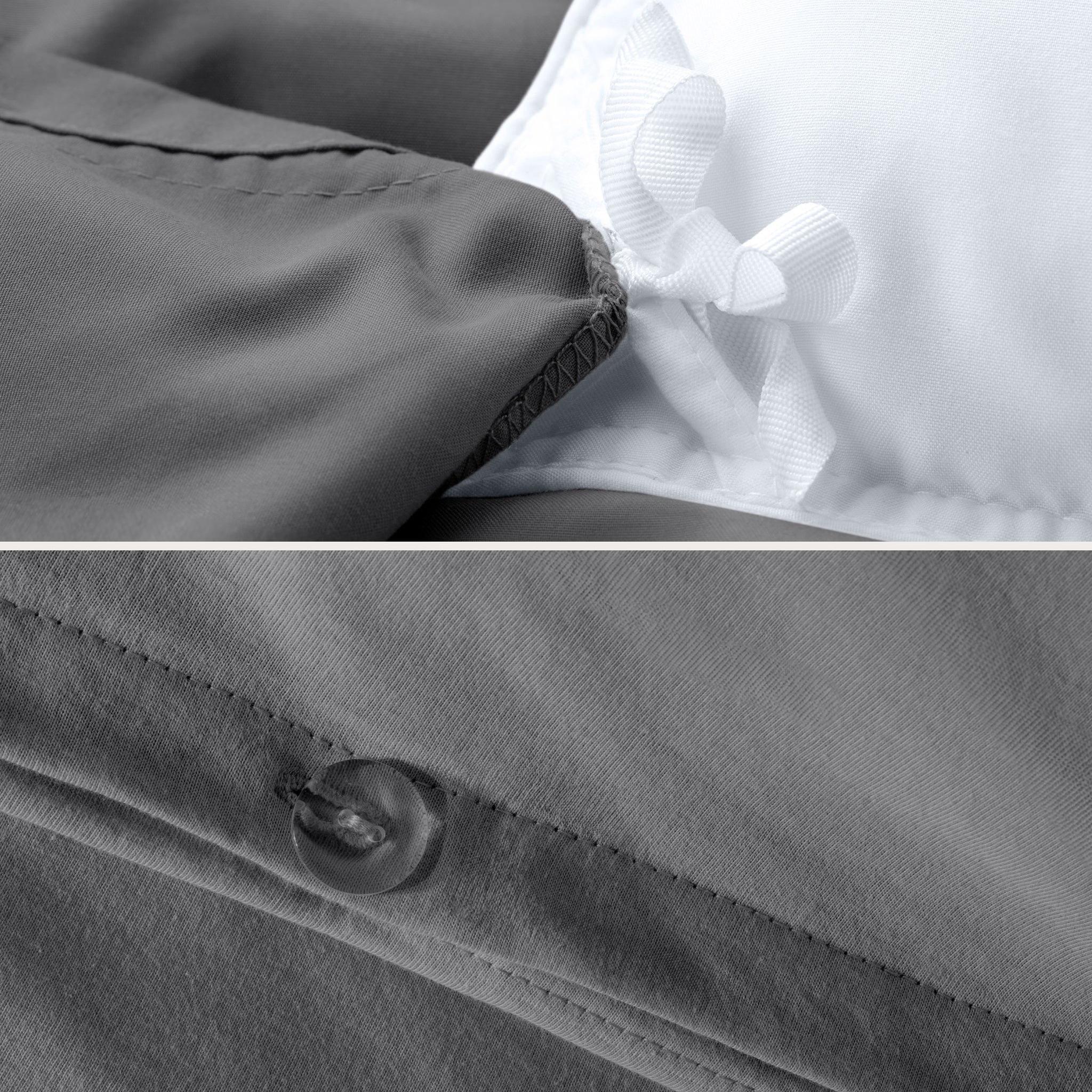 Internal corner and side ties secure to your duvet to keep it in place, and a hidden button closure conceals it. Tailored shams or envelope pillowcases keep pillows neat and tidy with an overlapping closure in the back.