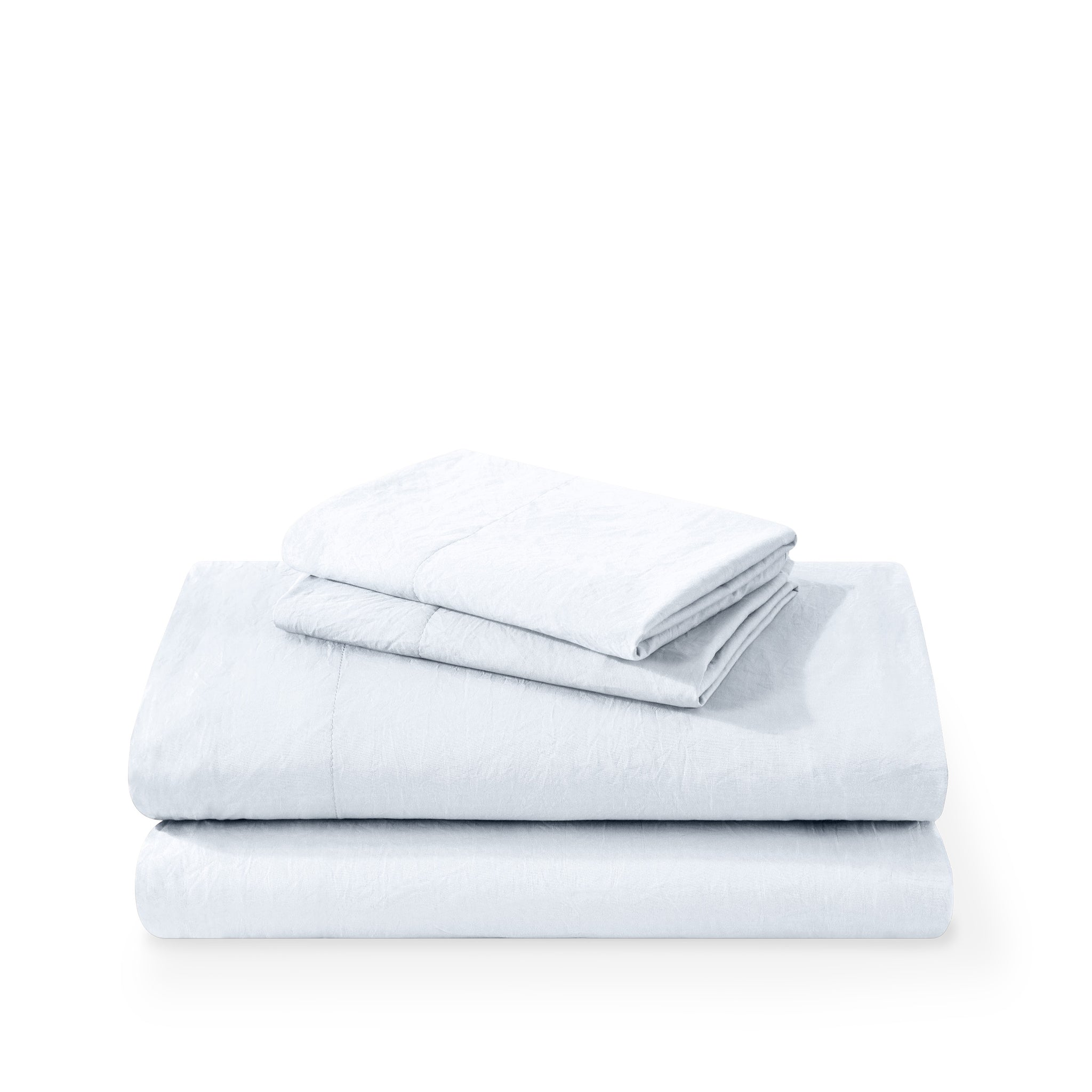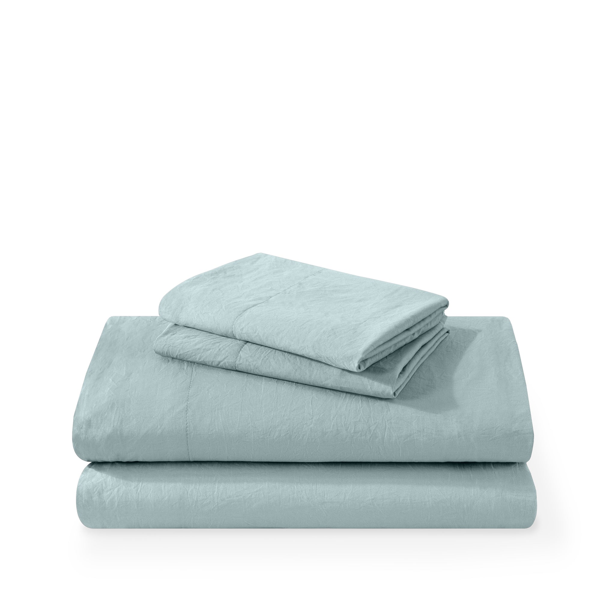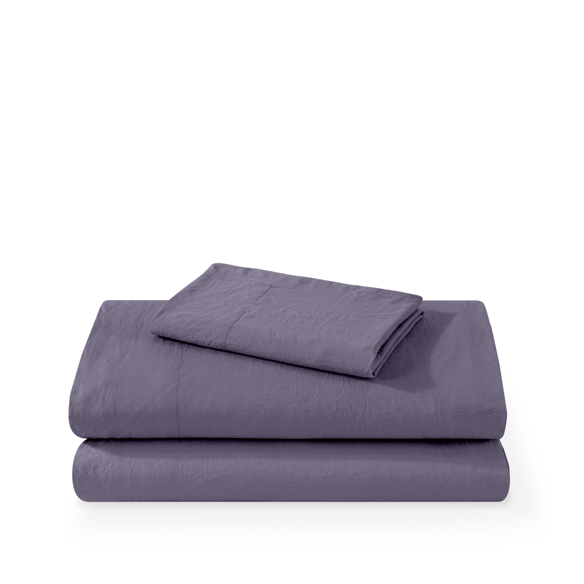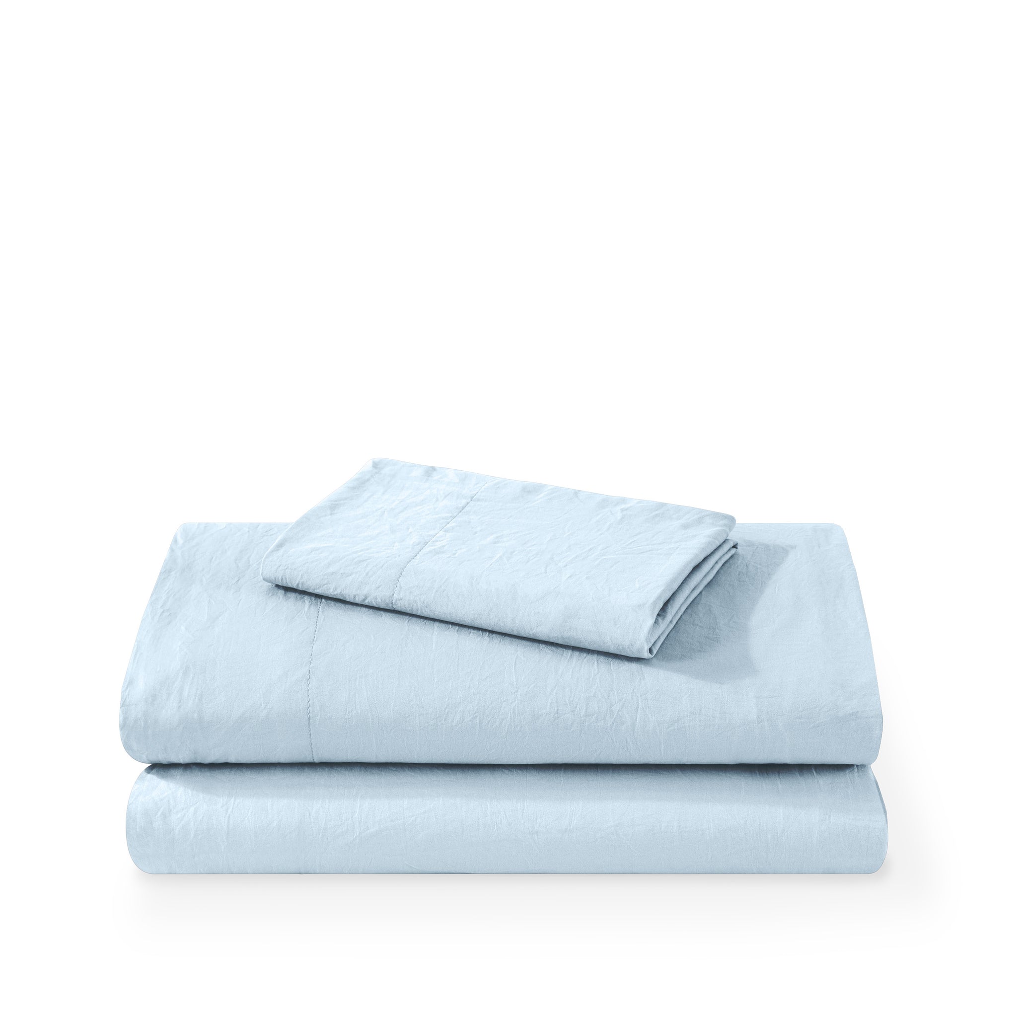 Washed duvet cover and sham set folded and stacked on a white background