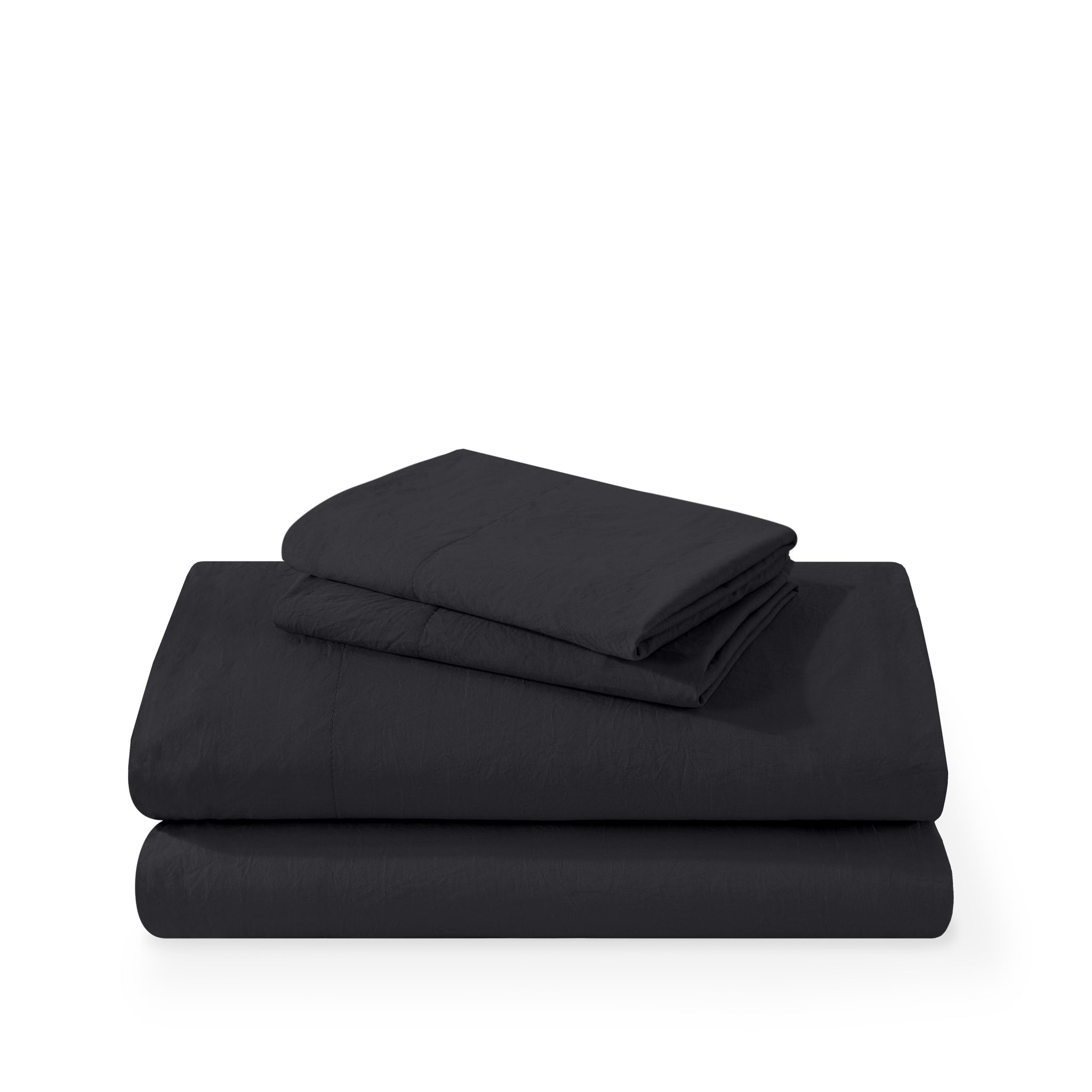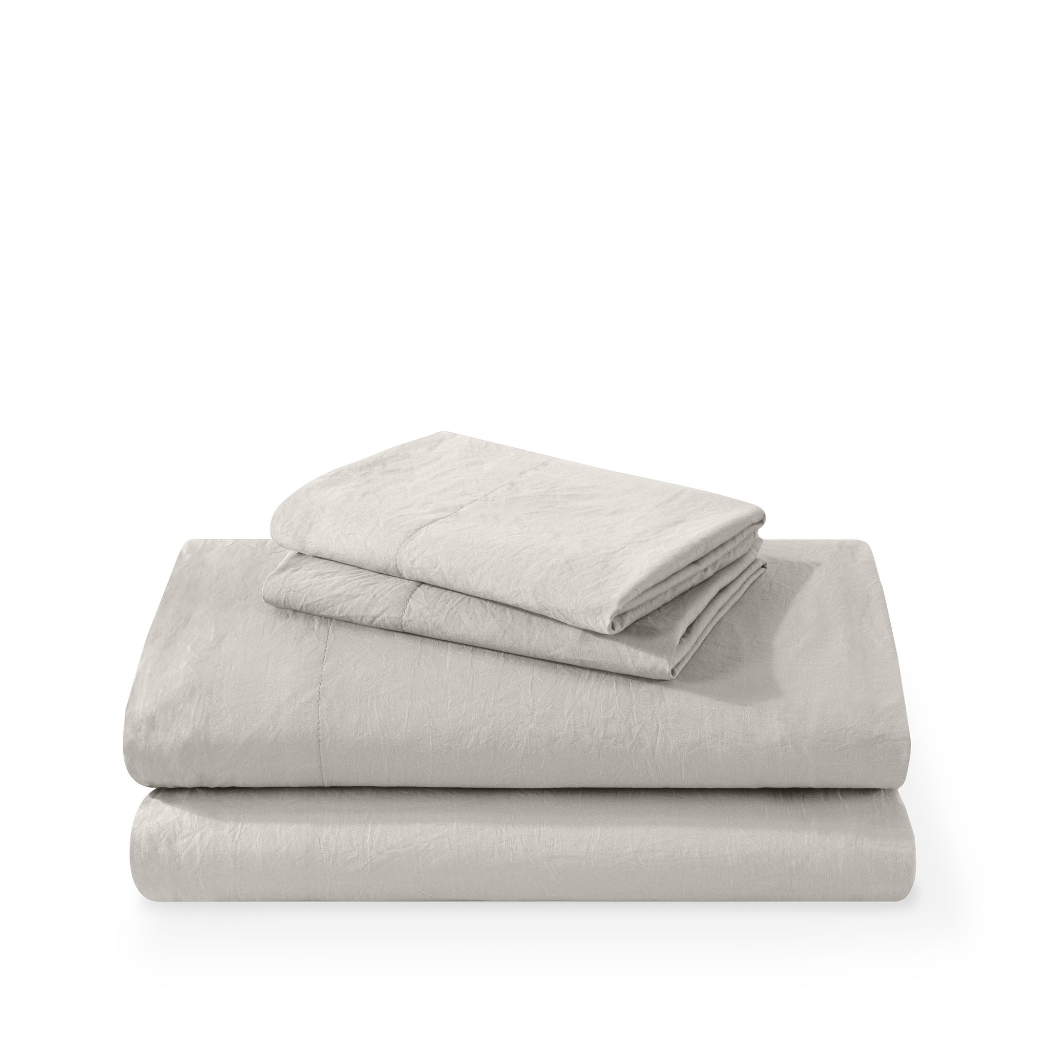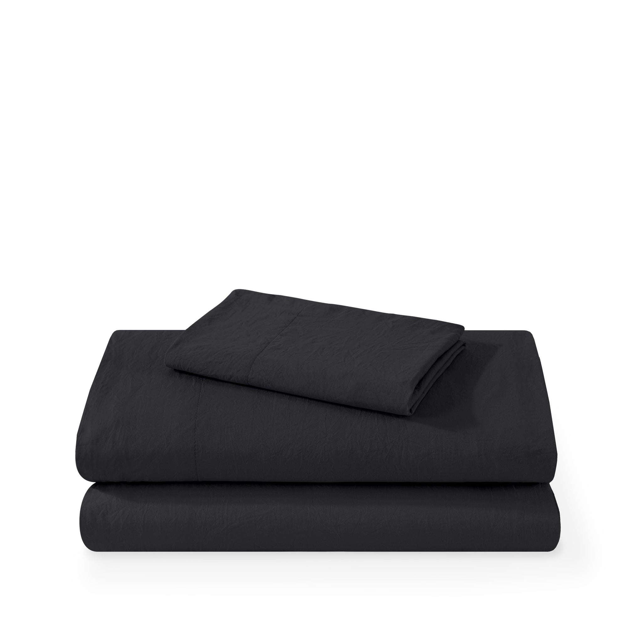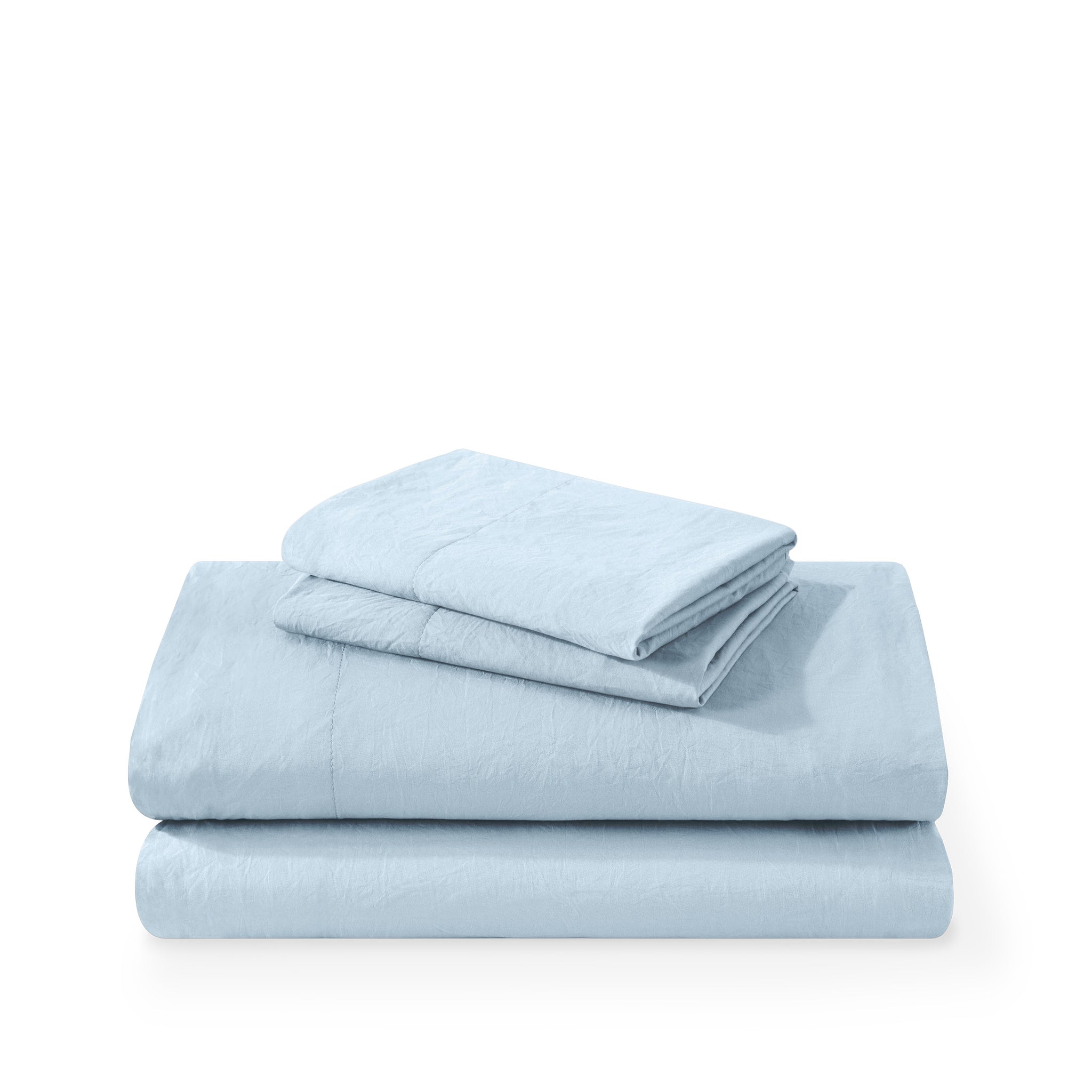 Washed duvet cover and sham set folded and stacked on a white background
