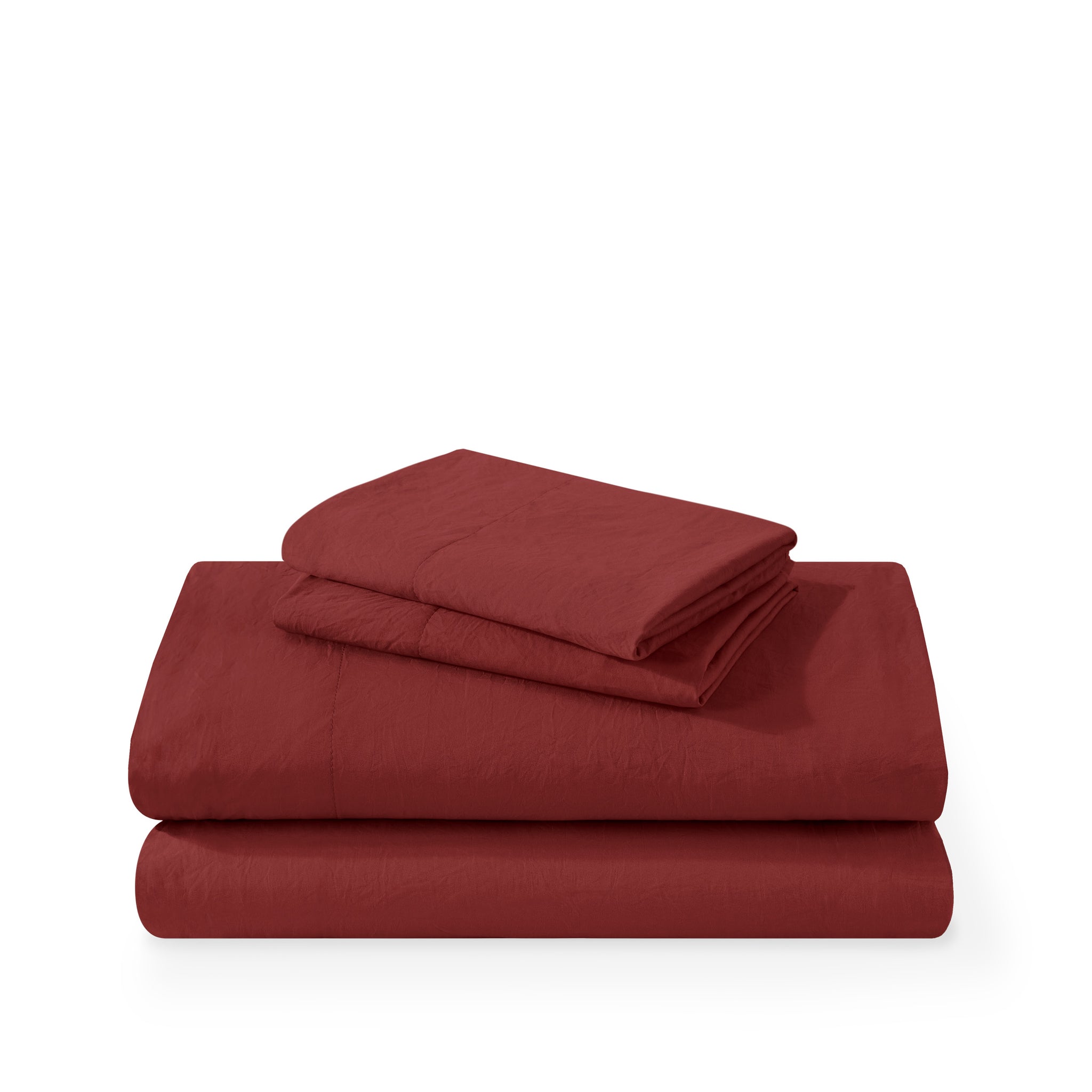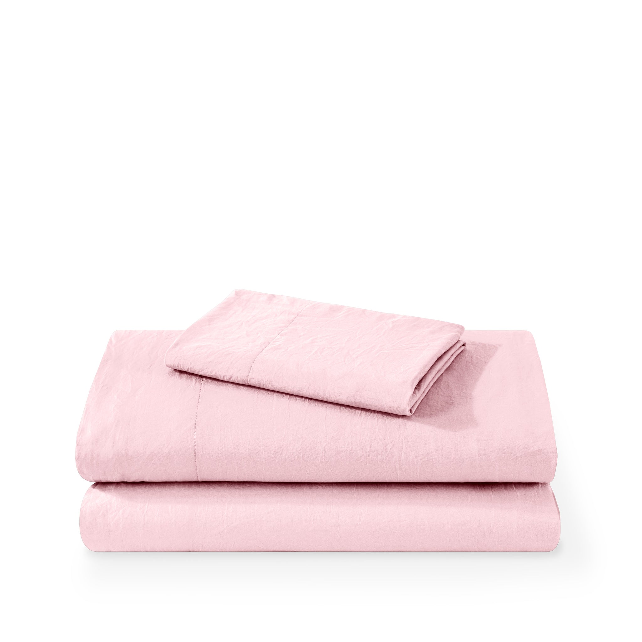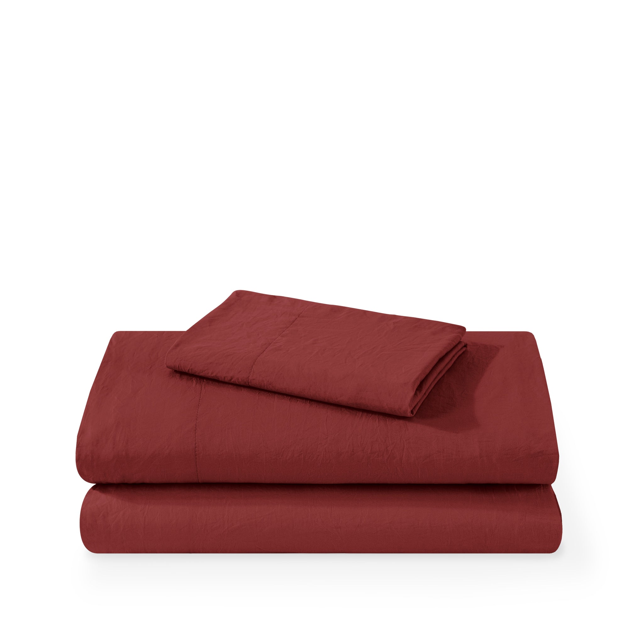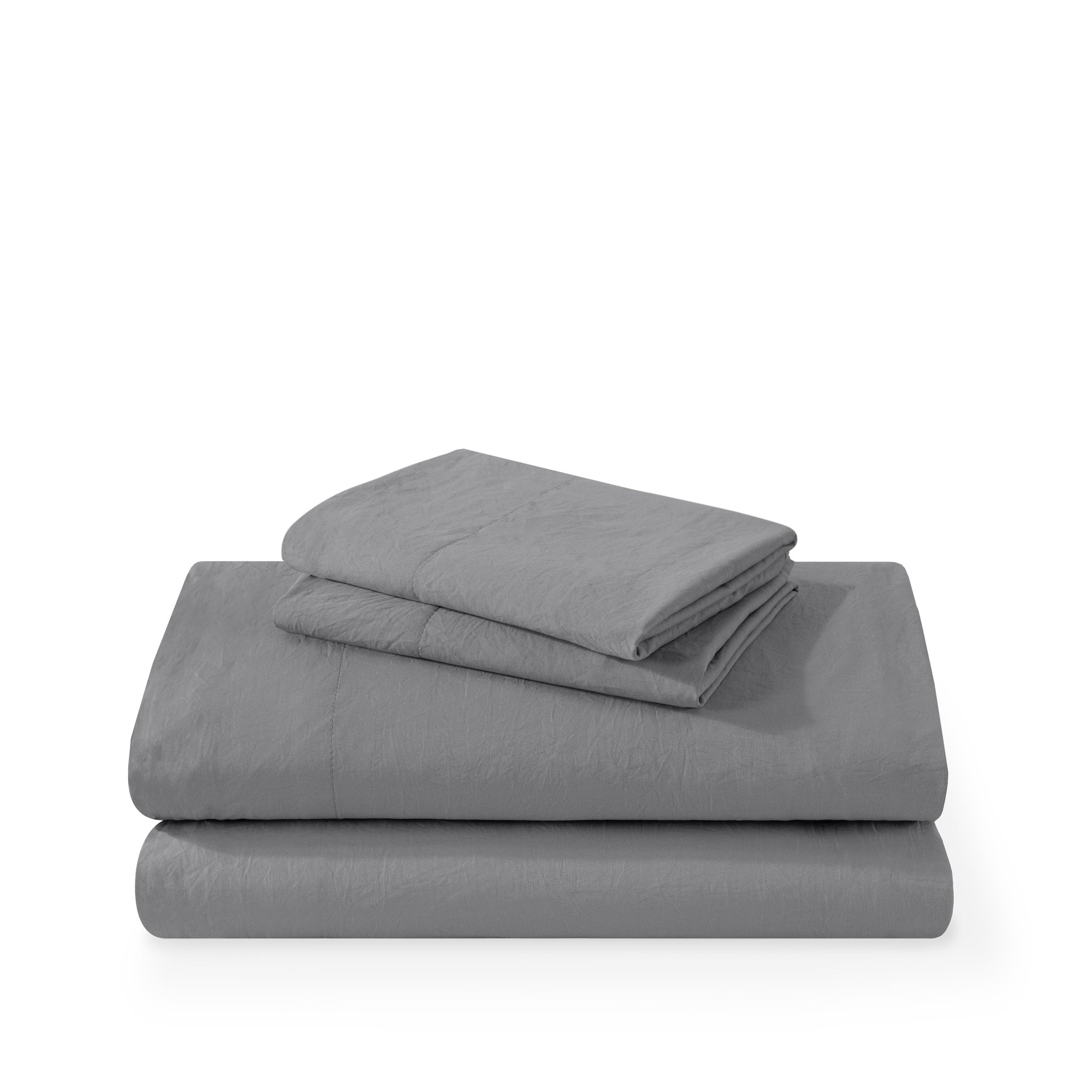 Washed duvet cover and sham set folded and stacked on a white background